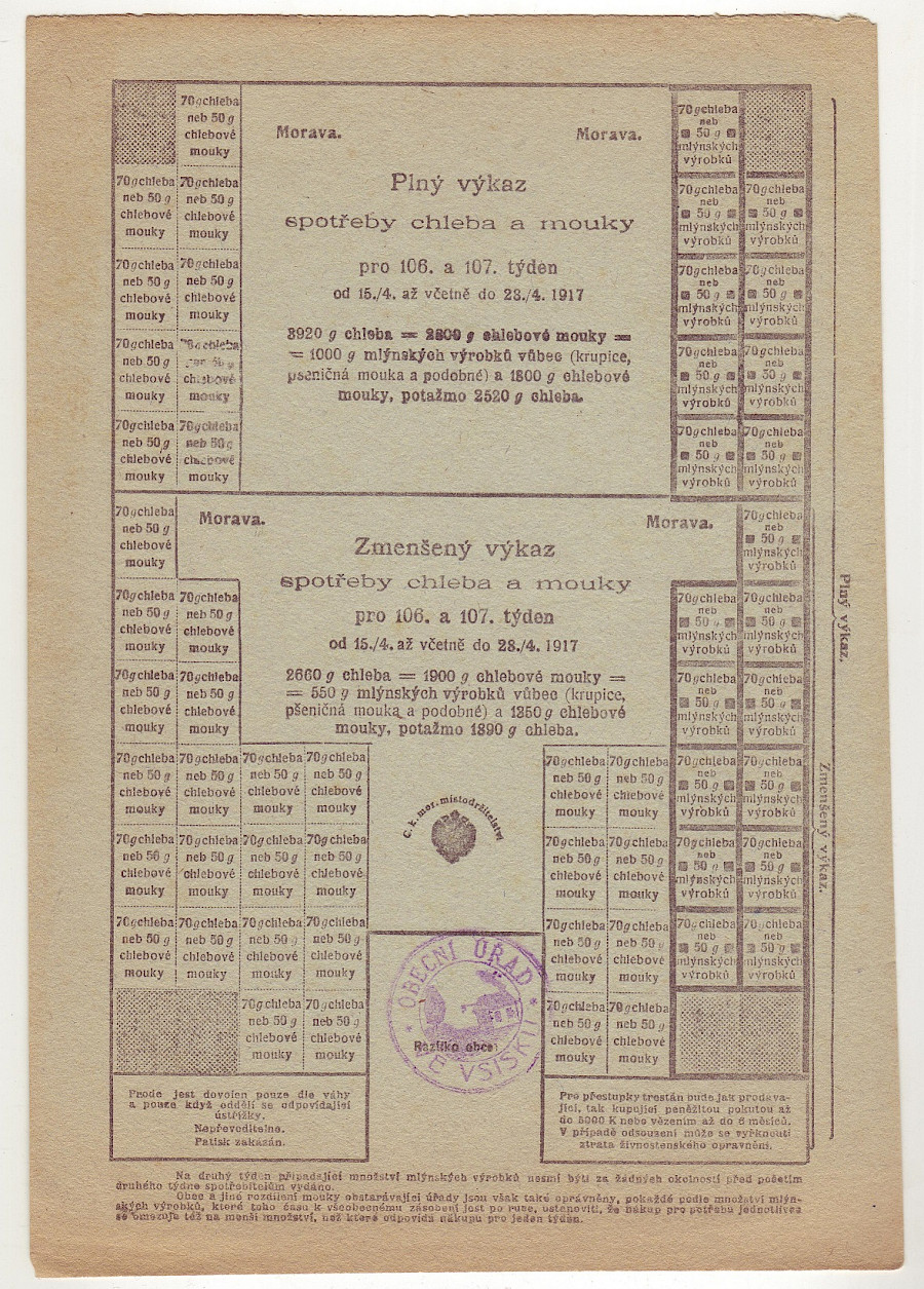 Morava - Výkaz spotřeby chleba a mouky 106. a 107. týden 1917