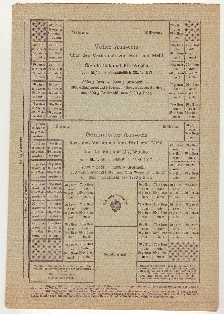 Výkaz spotřeby chleba a mouky 106. a 107. týden 15.4. až 23.4. 1917, oboustranný česko-německý , Vsisko