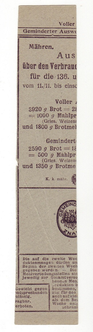Výkaz spotřeby chleba a mouky 136. a 137. týden 11.11. až 24.11. 1917,částečný oboustranný česko-německý , Znojmo