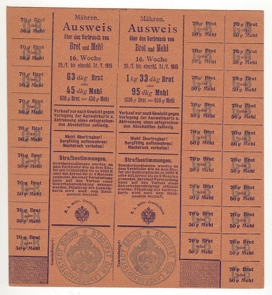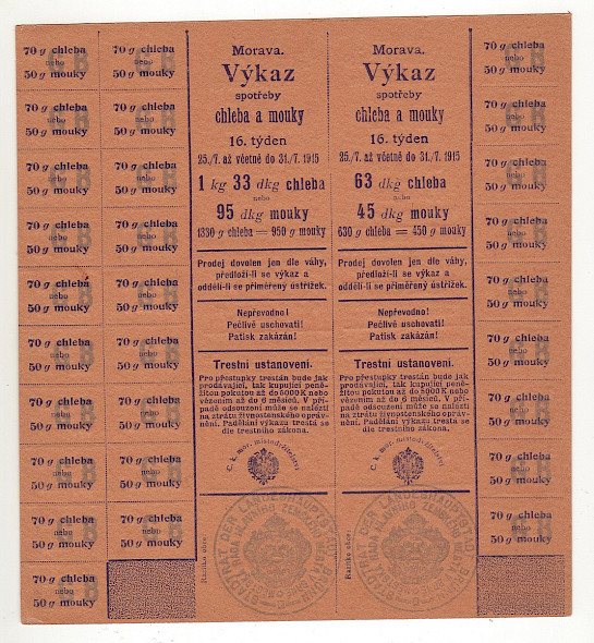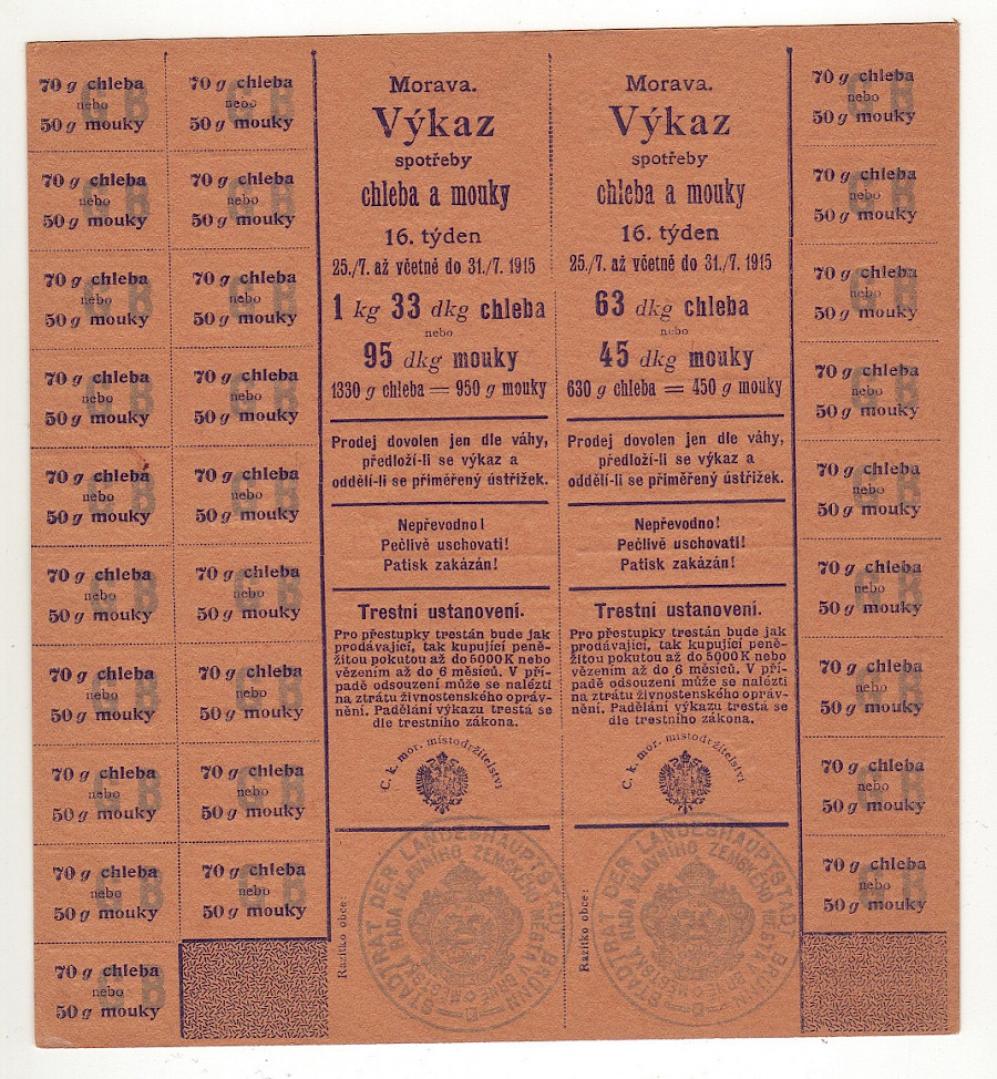 Výkaz spotřeby chleba a mouky 16.týden 25.7. až 31.7.1915 , oboustranný česko-německý , Brno