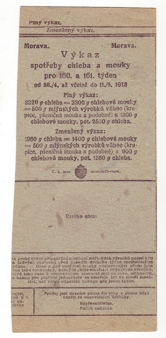 Morava - Výkaz spotřeby chleba a mouky 160. a 161. týden 1918
