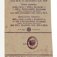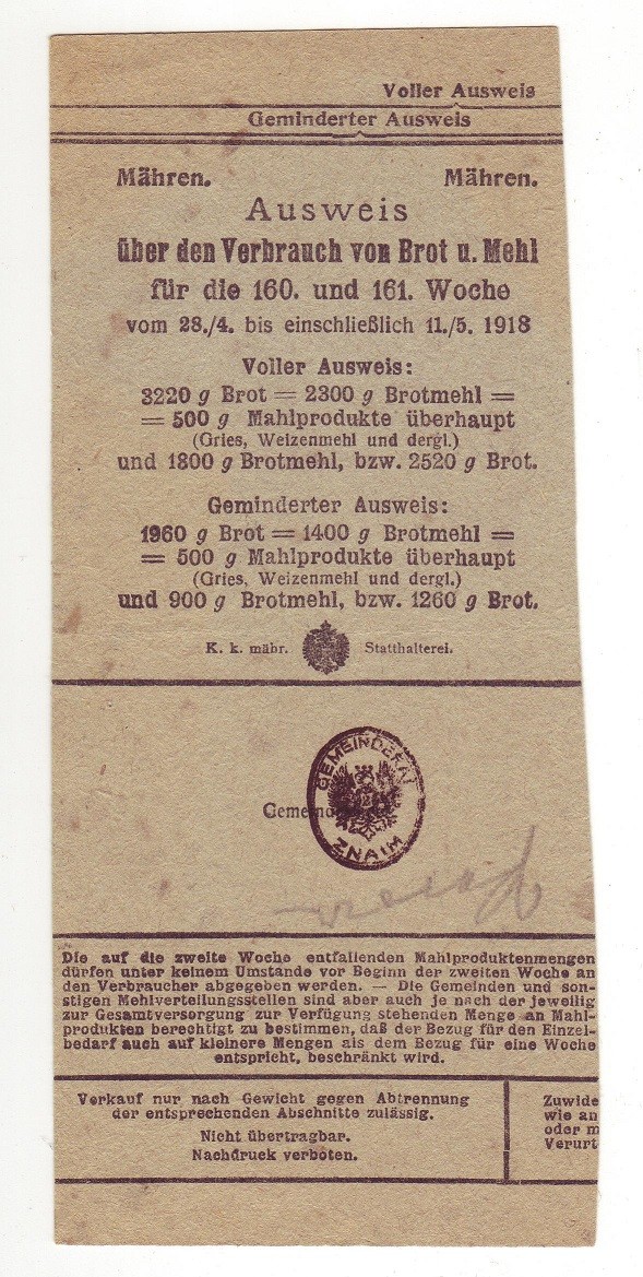 Výkaz spotřeby chleba a mouky 160. a 161. týden 28.4. až 11.5. 1918, částečný lístek , oboustranný česko-německý , Znojmo