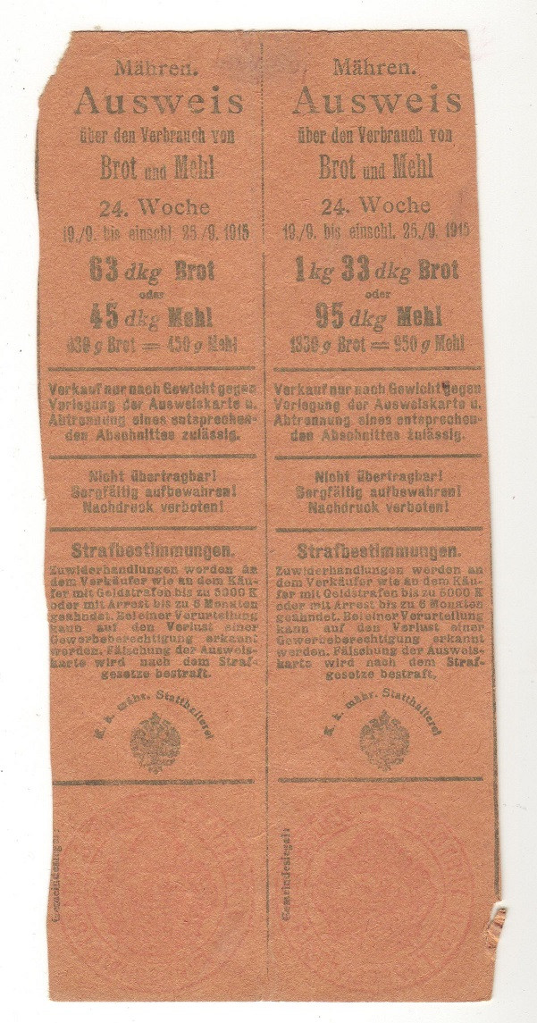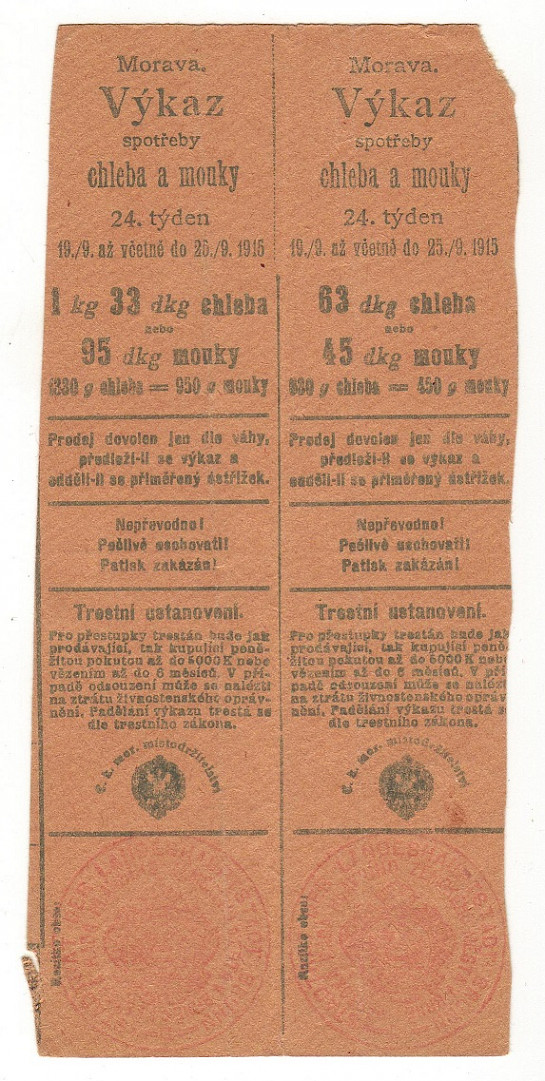Výkaz spotřeby chleba a mouky 24.týden 19.9. až 25.9. 1915, částečný , oboustranný česko-německý , Brno