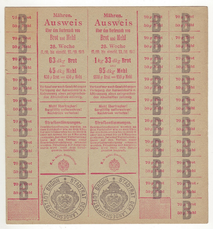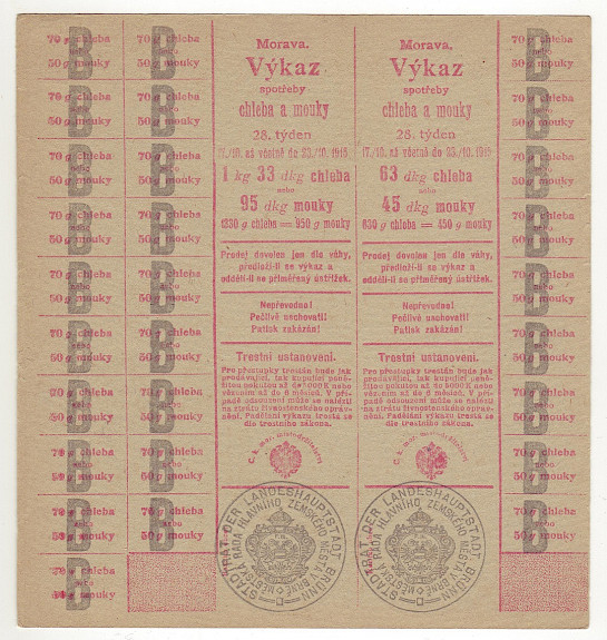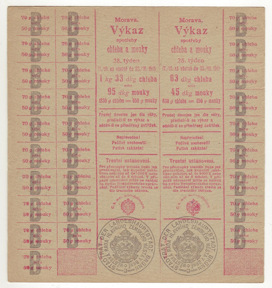 Výkaz spotřeby chleba a mouky 28.týden 17.10. až 23.10. 1915, oboustranný česko-německý , Brno