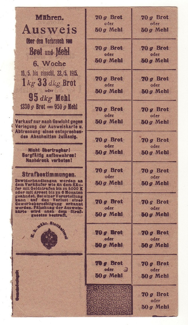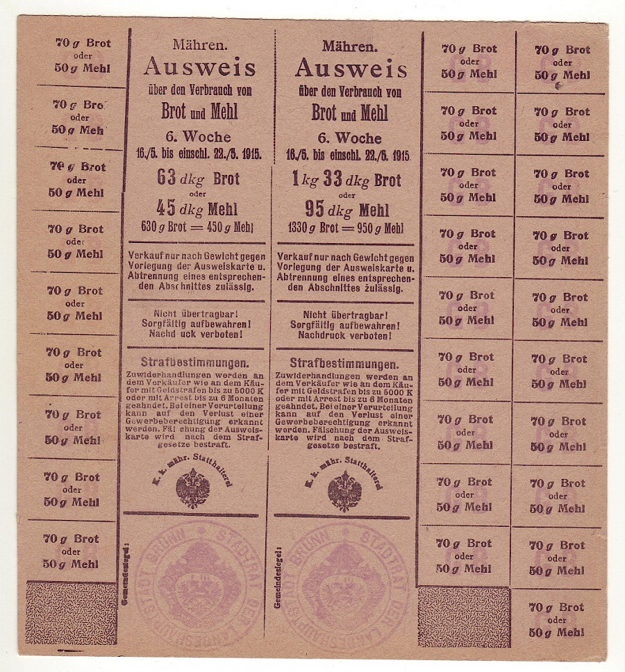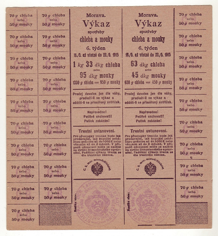 Morava - Výkaz spotřeby chleba a mouky 6.týden 16.5 až 22.5 1915 , kompletní(Brno) + částečný(Přerov) , oboustranný česko-německý