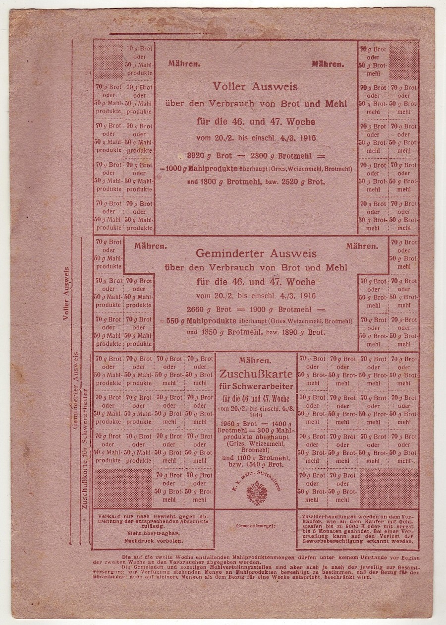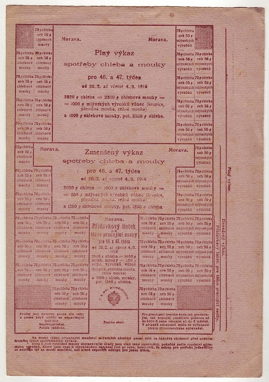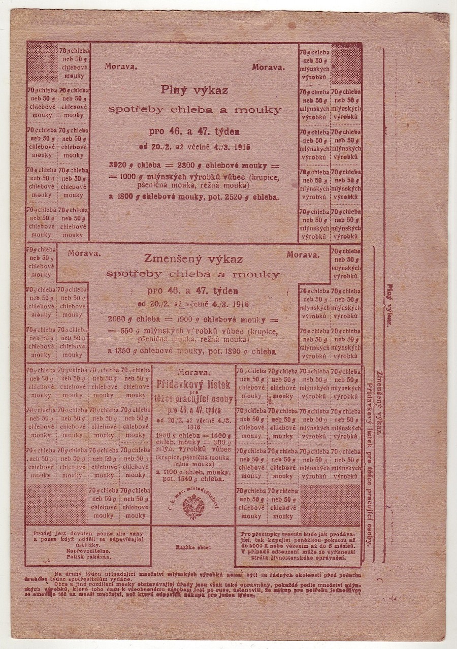 Výkaz spotřeby chleba a mouky 46. a 47. týden 20.2. až 4.3. 1916, oboustranný česko-německý