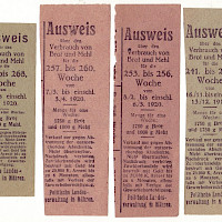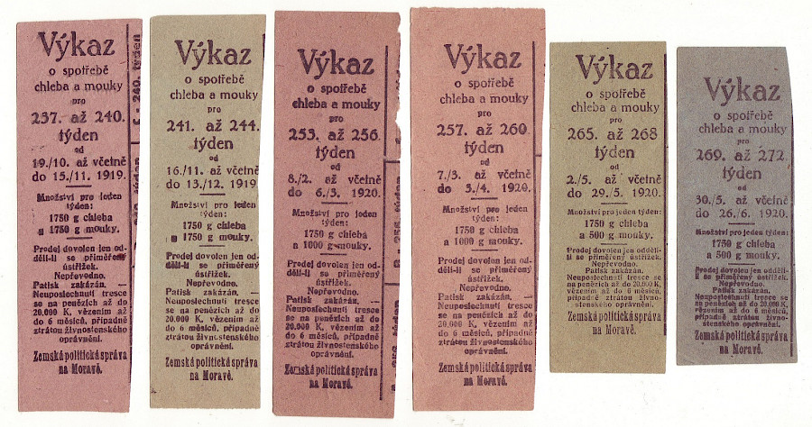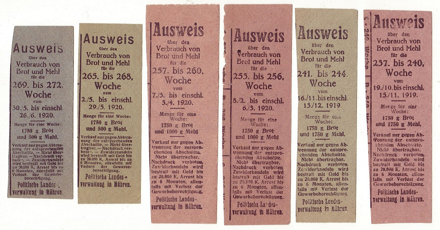 Výkaz spotřeby chleba a mouky pro 237. až 272. týden 19.10.1919 až 26.6. 1920, 6 x částečný lístek , oboustranný česko-německý