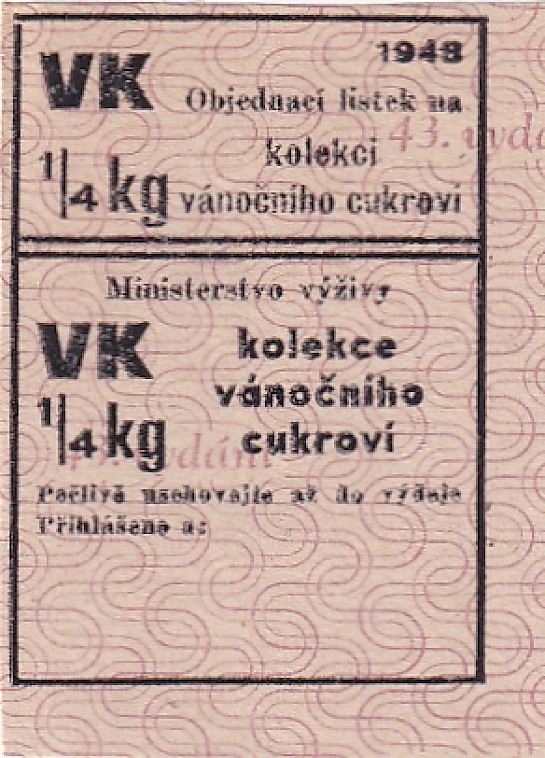 Objednací lístek na kolekci vánočního cukroví 43.vydání říjen 1948 , lístky na 1/4 kg a 1 kg cukroví