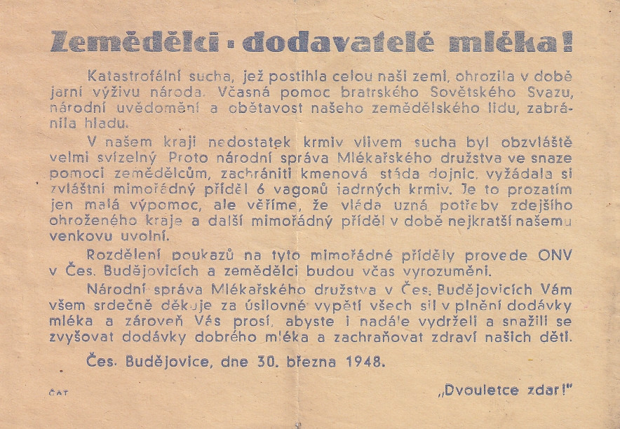 Propaganda letáček-Zemědělci,dodavatelé mléka-Rozdělení poukazů-Dvouletce zdar-30.3.1948