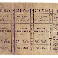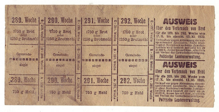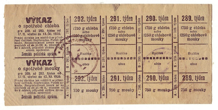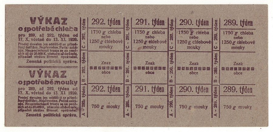 Výkaz o spotřebě chleba a mouky 289. až 292. týden,kompletní lístek + oboustranný,česko-německý Hrabenová