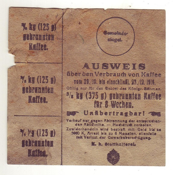 Výkaz o spotřebě kávy 29.10. až 23.12.1916 , verze v němčině