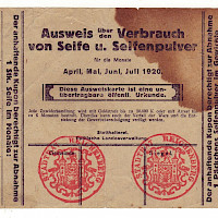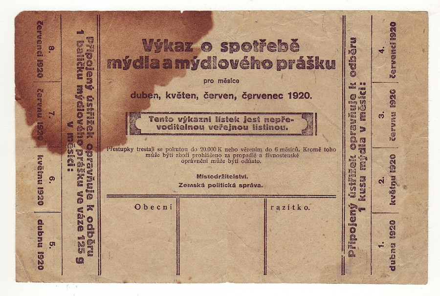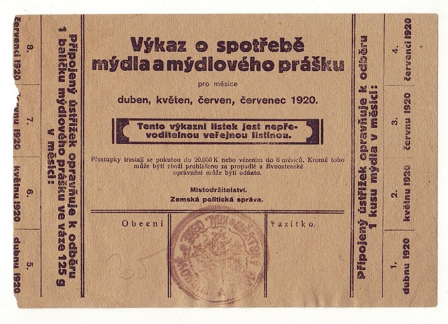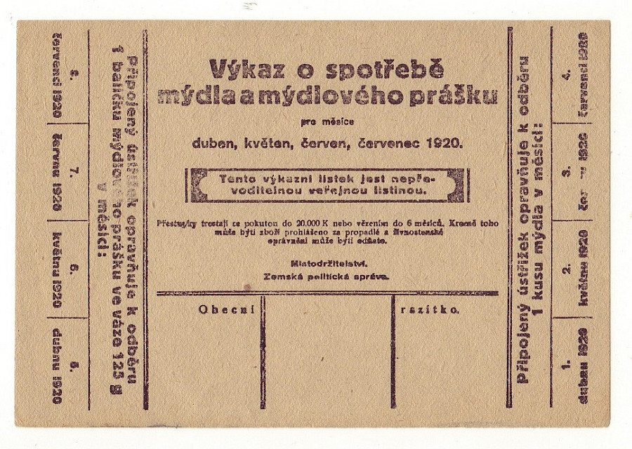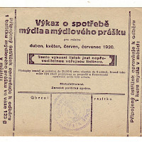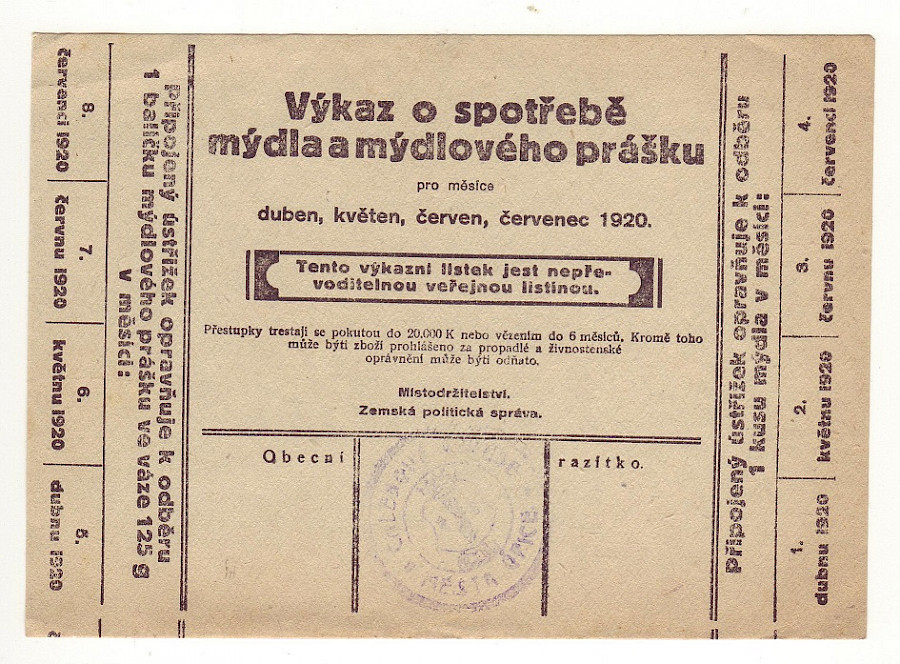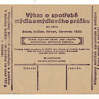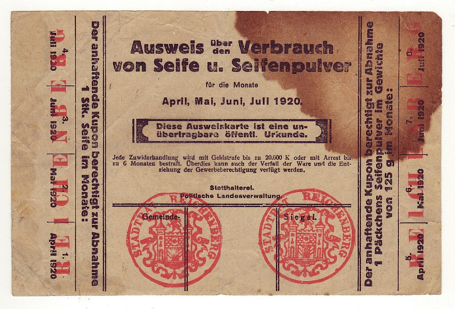 Výkaz o spotřebě mýdla a mýdlového prášku na duben,květen,červen,červenec 1920 , čtyři varianty,Liberec oboustranná česko-německá