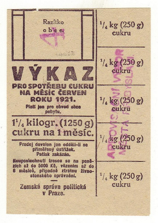 Výkaz pro spotřebu cukru na měsíc červen 1921 , Přibyslav