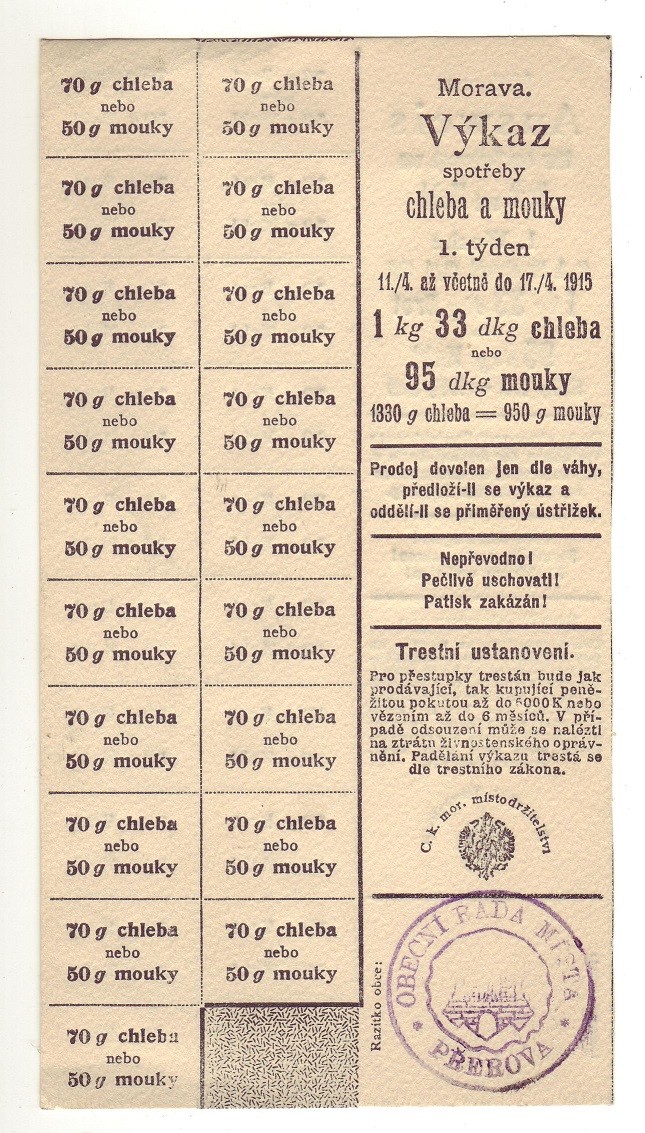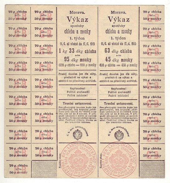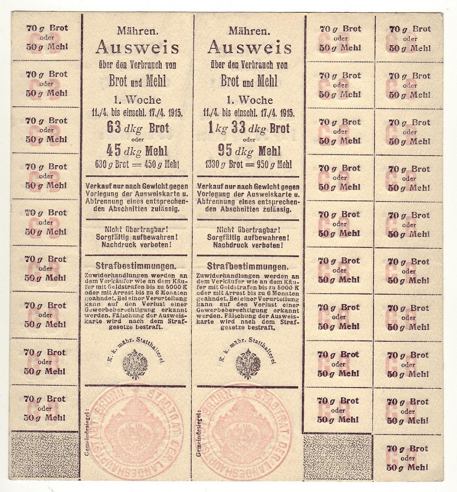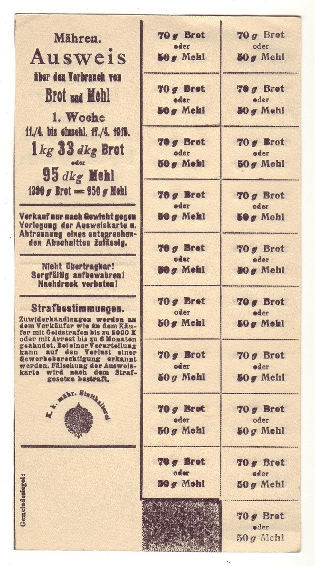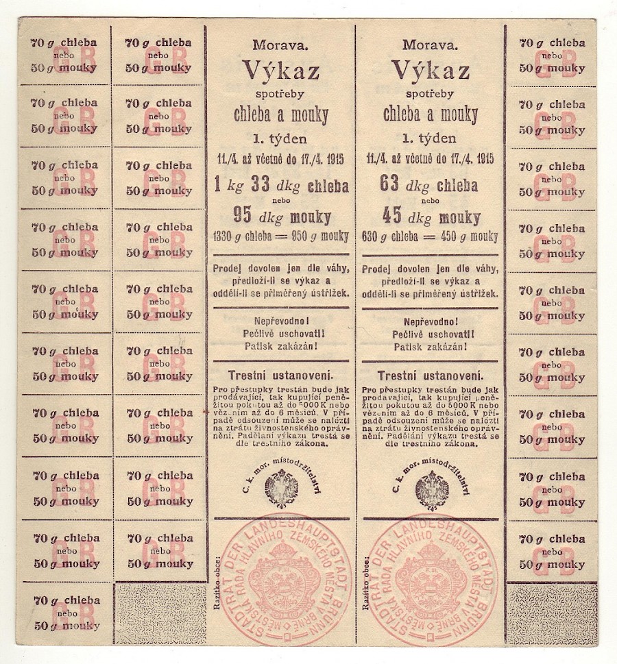 Výkaz spotřeby chleba a mouky 1.týden 11.4 až 17.4 1915 , kompletní(Brno) + částečný(Přerov) lístek , oboustraný , česko-německý