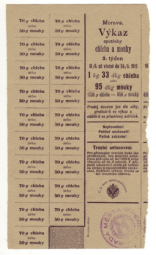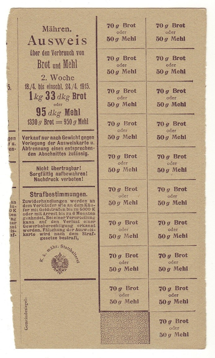Výkaz spotřeby chleba a mouky 2.týden , 18.4 až 24.4.1915 , oboustranný , česko-německý , částečný