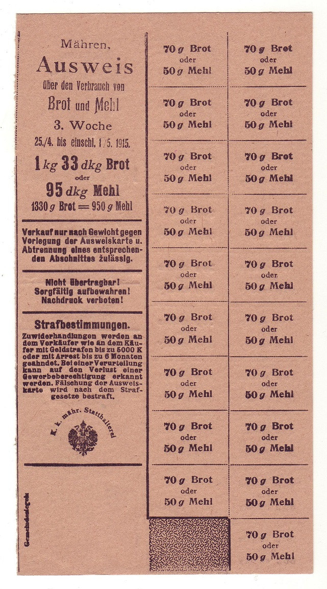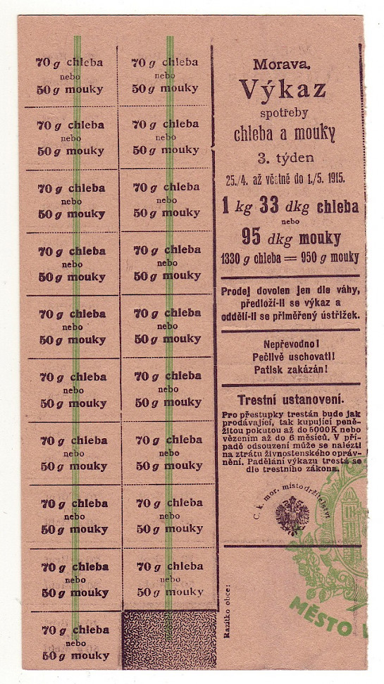 Výkaz spotřeby chleba a mouky 3.týden 25.4 až 1.5. 1915, částečný lístek , oboustranný česko-německý , Přerov