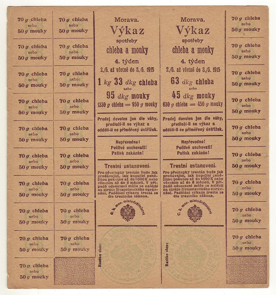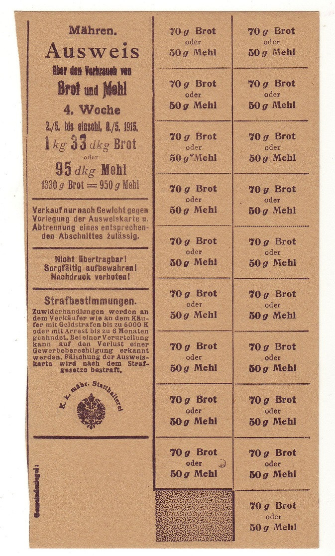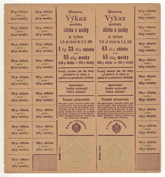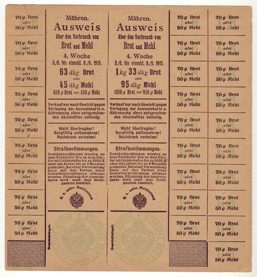 Výkaz spotřeby chleba a mouky 4.týden 2.5. až 8.5 1915 , kompletní(Brno) + částečný(Přerov) , oboustranný česko-německý