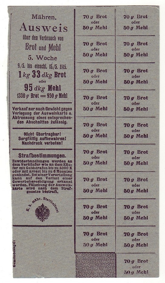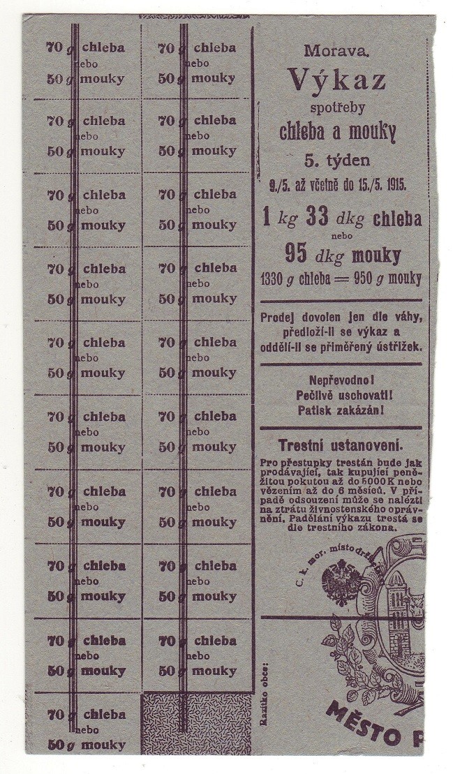 Výkaz spotřeby chleba a mouky 5.týden 9.5 až 15.5. 1915 , částečný , oboustranný česko-německý , Přerov