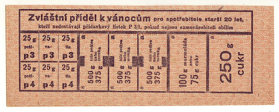 Zvláštní příděl k vánocům pro spotřebitele starší 20 let,kteří nedostávají přídavkový lístek 8./P3/I 10.XII.1945-6.I.1946,pokud nejsou samozásobiteli obilím